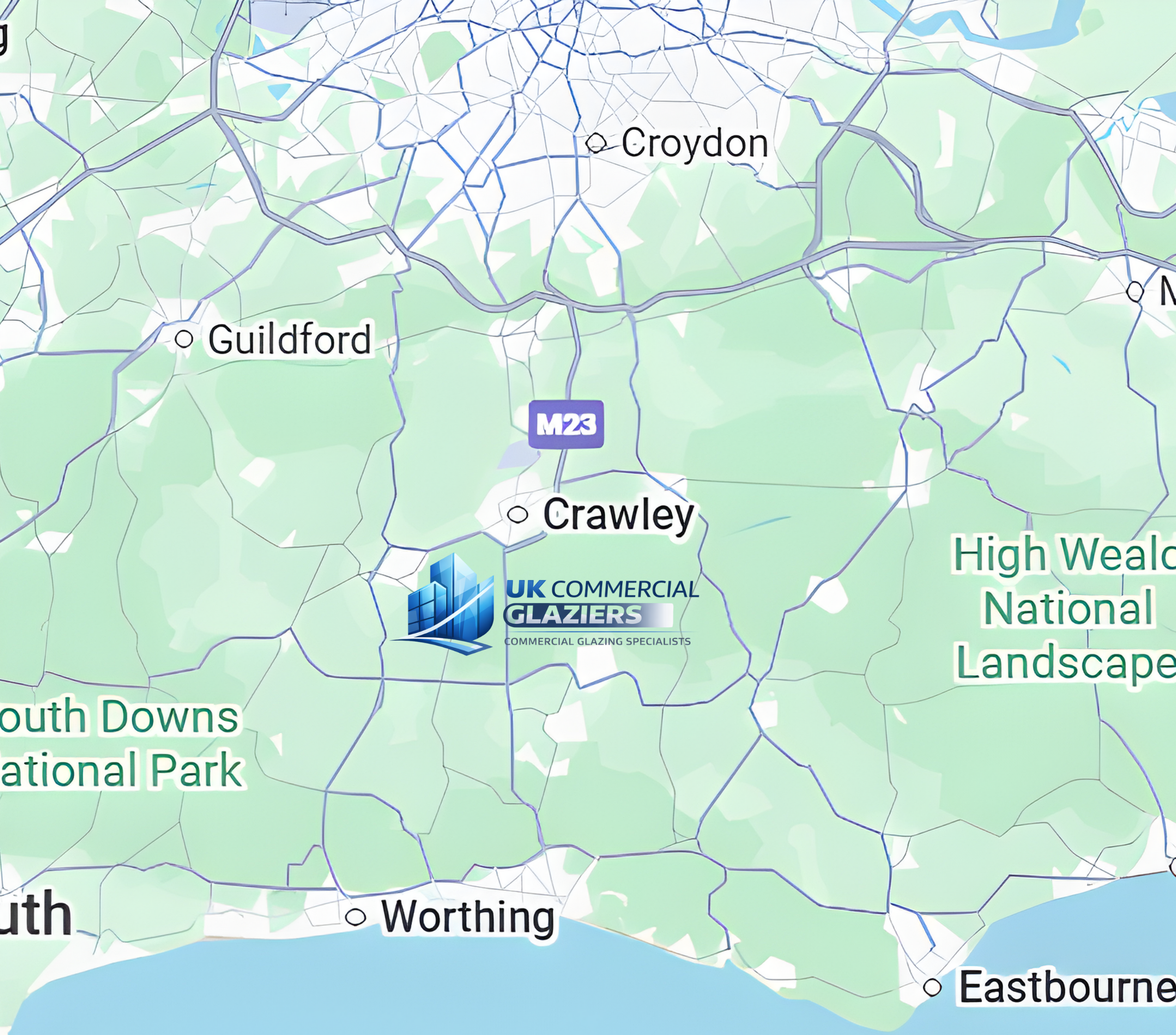 UK Commercial Glaziers provides professional commercial glazing services across the South East, operating within a 50-mile radius of Crawley, West Sussex.
